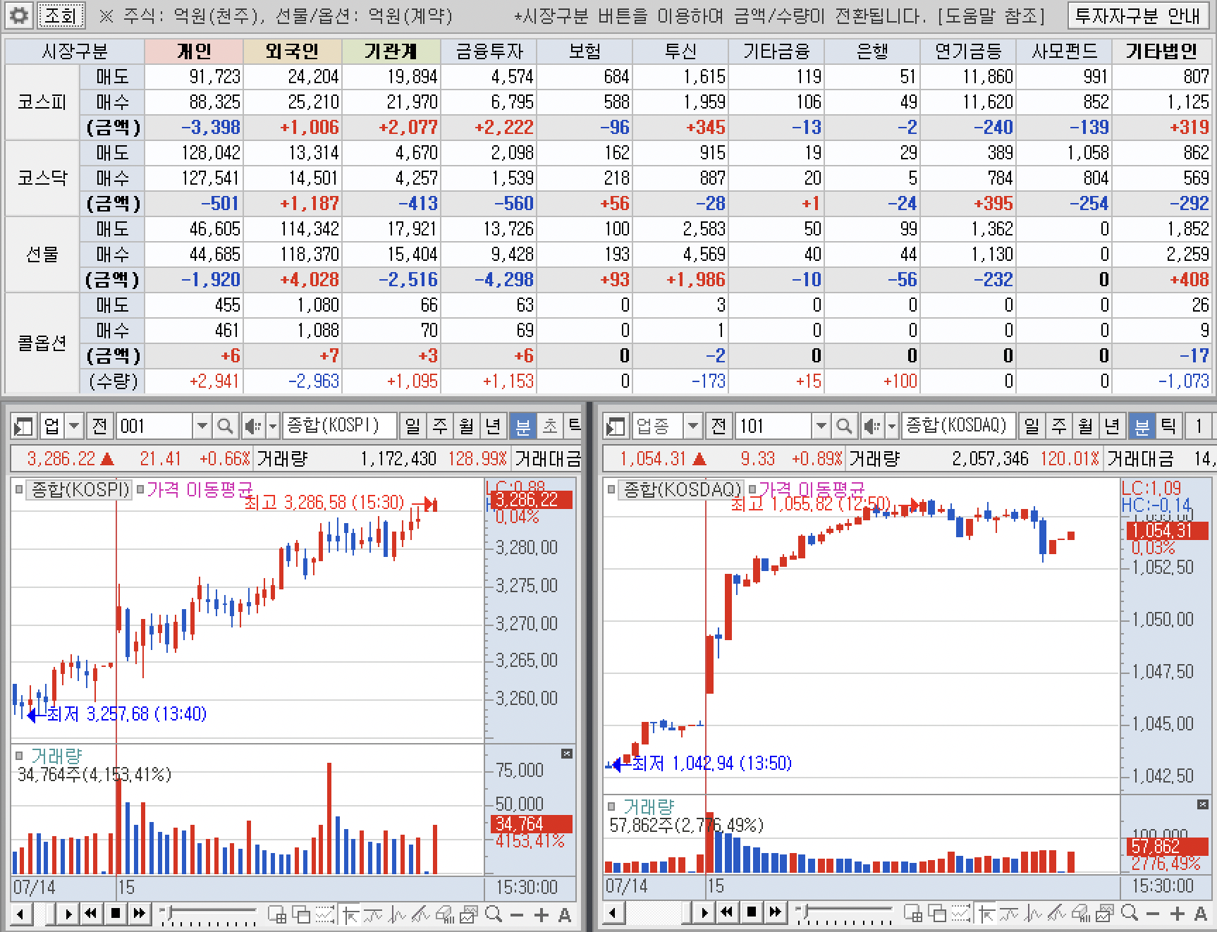 코스피는 양매수.. 외국인과 기관 매수이지만 금투가 주포로 매수하면서 양매수 마감